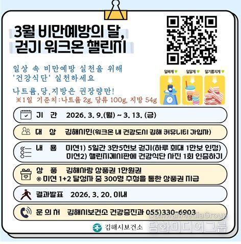 김해시보건소 관계자는 “비만 예방은 가벼운 산책과 물 마시기, 달콤한 간식을 줄이는 작은 선택에서부터 시작된다”며, “이번 챌린지를 통해 시민들이 일상 속에서 건강한 변화를 직접 경험하고, 가벼운 몸과 마음으로 활력을 되찾길 바란다”고 전했다.