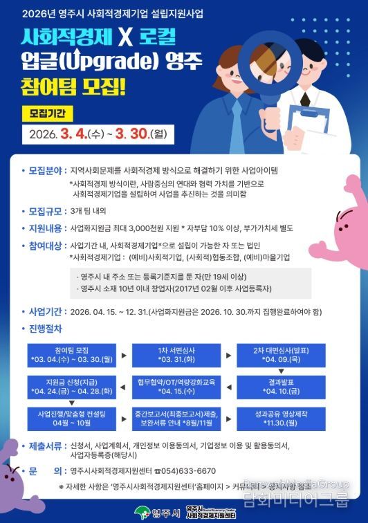 시는 ‘2026 사회적경제×로컬 업글(Upgrade) 영주’ 사업에 참여할 팀을 3월 4일부터 30일까지 모집한다고 밝혔다.