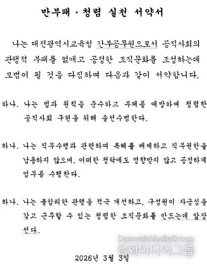 아울러 이날 청렴 서약 실천에 이어 교육감이 주재하는 ‘반부패·청렴 정책 기획단’ 회의를 통해 2026년 반부패·청렴 정책 추진 기본 계획을 공유하고 실천 방안을 논의하는 시간을 가졌다.