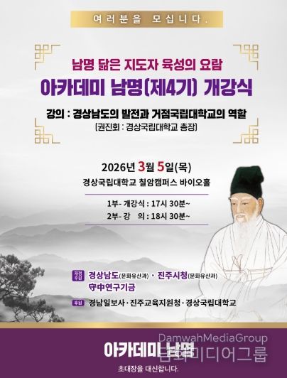 시민행정신문 강갑수 기자 | 남명 닮은 지도자 육성의 도장을 표방하는 ‘아카데미 남명’ 제4기 개강식 및 제1강이 3월 5일 오후 5시 30분부터 경상국립대학교 칠암캠퍼스 바이오 홀(생명과학관 2호)에서 시작된다.