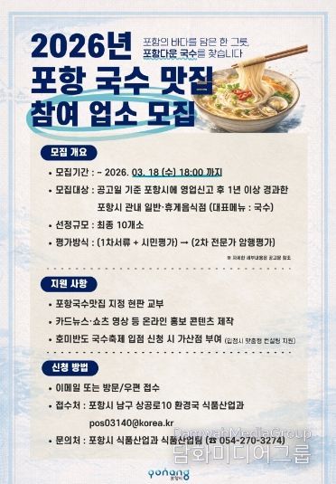 모집 대상은 공고일 기준 포항시에서 1년 이상 영업 중인 일반·휴게음식점 중 국수를 대표 메뉴로 취급하는 업소다.