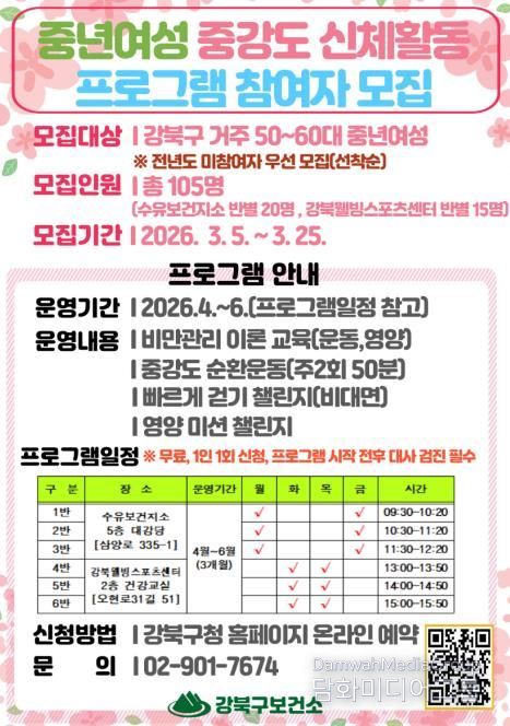 모집 대상은 강북구에 거주하는 1956~1976년생 여성 총 105명이다. 참여 신청은 5일부터 25일까지 강북구청 홈페이지 통합예약 시스템을 통해 선착순으로 진행된다. 프로그램은 4월 1일부터 6월 30일까지 12주간 운영되며, 수유보건지소와 강북웰빙스포츠센터에서 6개 반으로 나뉘어 주 2회, 회당 50분씩 중강도 운동을 실시한다.