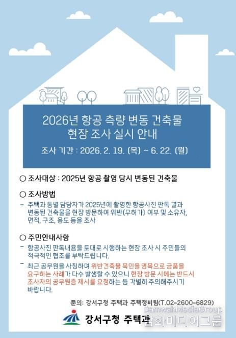 시민행정신문 강갑수 기자 | 서울 강서구는 허가받지 않고 신축·증축·개축 등 변동된 건축물을 대상으로 6월 22일까지 현장조사를 실시한다고 밝혔다.