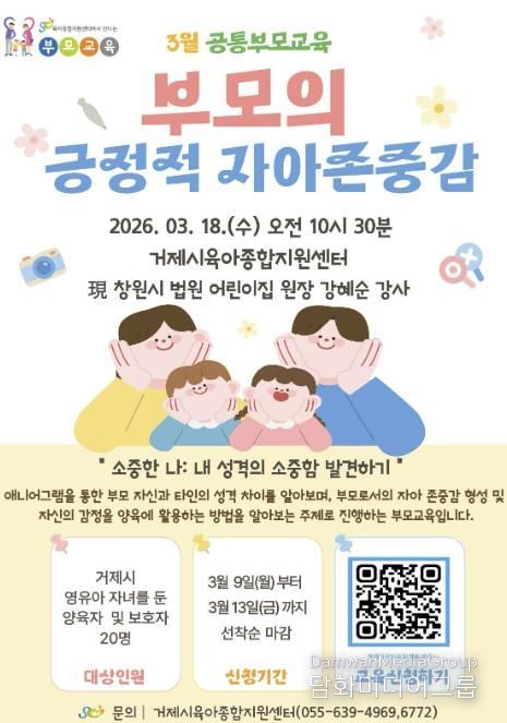 거제시육아종합지원센터 센터장은 “부모의 자아존중감은 자녀의 정서 발달과 건강한 성장에 매우 중요한 기반이 되므로 이번 교육이 부모 스스로를 돌아보고, 자녀의 강점을 발견하는 의미 있는 시간이 되길 바란다”고 전했다. 이어 “앞으로도 지역 부모들이 양육 과정에서 겪는 고민을 함께 나누고, 실질적인 도움을 제공하는 교육을 지속적으로 확대해 나가겠다”고 밝혔다.