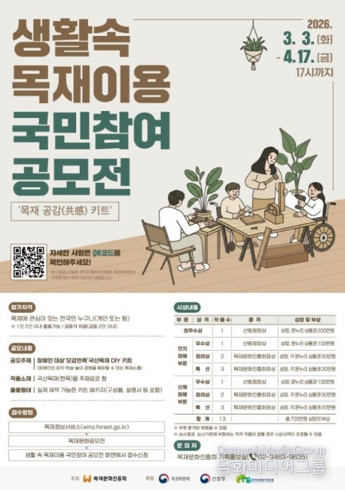 이상익 산림청 산림산업정책국장은 “이번 공모전은 장애인의 관점에서 공감하고 설계하는 목재 체험 콘텐츠를 발굴하는 데 의미가 있다.”며 “국산목재의 따뜻한 감성과 공익적 활용 가치를 확산하는 계기가 되길 기대한다.”고 말했다.