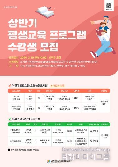 시민행정신문 기자 | 경상북도교육청 봉화도서관(관장 이영숙)은 지역 주민의 평생학습 기회를 넓히기 위해 상반기 평생교육 및 토요 늘봄도서관 프로그램 수강생을 모집한다.