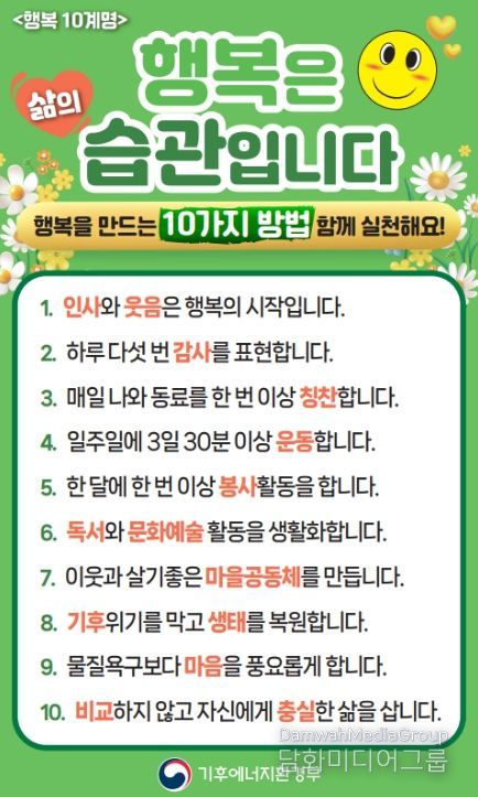 이에 앞서 기후에너지환경부는 2월 9일부터 직원들을 대상으로 ‘행복은 삶의 습관입니다’를 주제로 행복 10계명 실천 운동을 펼치고 있다.