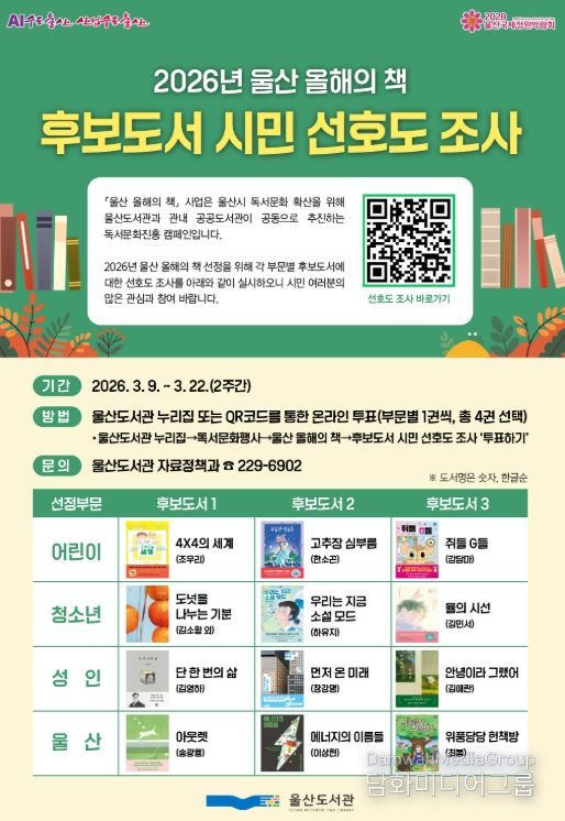 선호도 조사는 3월 9일 오전 9시부터 울산도서관 누리집을 통해 시민 누구나 참여 가능하다.