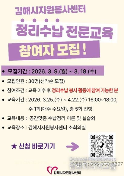 시민행정신문 강갑수 기자 | 김해시자원봉사센터는 지역사회 취약계층의 주거환경 개선과 자원봉사 전문성 강화를 위해 ‘정리수납 자원봉사자 양성교육’을 실시한다고 6일 밝혔다.