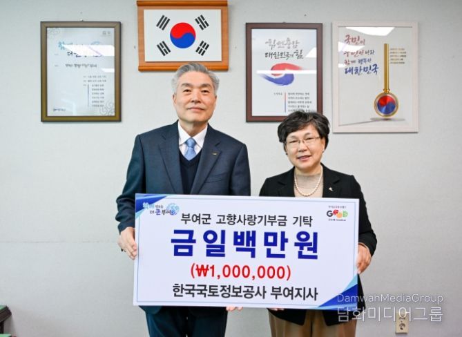 시민행정신문 강갑수 기자 | 한국국토정보공사 부여지사(지사장 서민식)가 부여군을 응원하기 위해 부여군청을 방문하여 고향사랑기부금 100만 원을 전달했다고 6일 밝혔다.