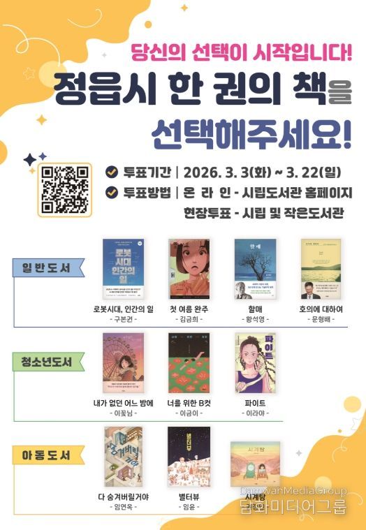 시민행정신문 강갑수 기자 | 정읍시가 시민이 함께 읽고 공감하는 독서문화 확산을 위해 2026년 ‘한 권의 책’ 선정을 위한 시민 투표를 오는 22일까지 온·오프라인으로 실시한다.