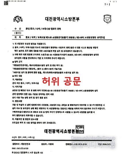 대전소방본부 관계자는 “최근 공공기관을 사칭한 범죄가 전국적으로 발생하고 있는 만큼 각별한 주의가 필요하다”며 “특히 종교시설, 숙박시설, 보육시설 등 시설 관계자들은 소방 관련 물품 구매 요청을 받을 경우 응하지 말고 즉시 관할 소방관서에 사실 여부를 확인해 피해를 예방해 달라”고 말했다.