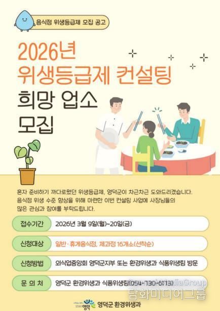 시민행정신문 강갑수 기자 | 영덕군은 지역 음식점의 위생 수준을 높이고 외식 환경의 경쟁력을 강화하기 위해 올해 ‘음식점 위생 등급제 컨설팅’ 사업에 참여 업소를 오는 9일부터 20일까지 선착순으로 모집한다.