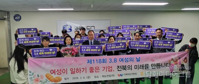 시민행정신문 강갑수 기자 | 전북특별자치도는 6일 제118회 세계 여성의 날을 맞아 전북여성가족재단, 농협중앙회 전북본부와 함께 여성친화기업 제논전장㈜를 방문해 여성 근로자들을 격려하고 성평등 조직문화 확산을 위한 기념행사를 개최했다.