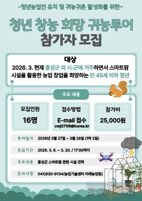 군 관계자는 “이번 프로그램은 미래 농업의 핵심인 청년들에게 홍성군의 스마트팜을 알리고, 안정적인 정착을 돕기 위해 마련했다”며, “홍성군에 우수한 농업 인재들이 모여 꿈을 펼칠 수 있도록 환경 조성에 노력하겠다”고 말했다.