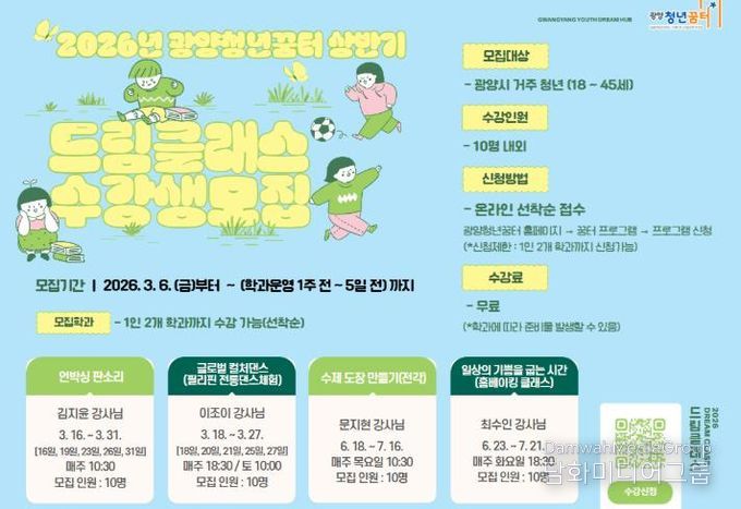시민행정신문 강갑수 기자 | 광양청년꿈터는 지역 청년이 직접 기획하고 운영하는 청년 주도형 학습 프로그램 ‘2026년 상반기 드림클래스’ 수강생을 모집한다고 밝혔다.