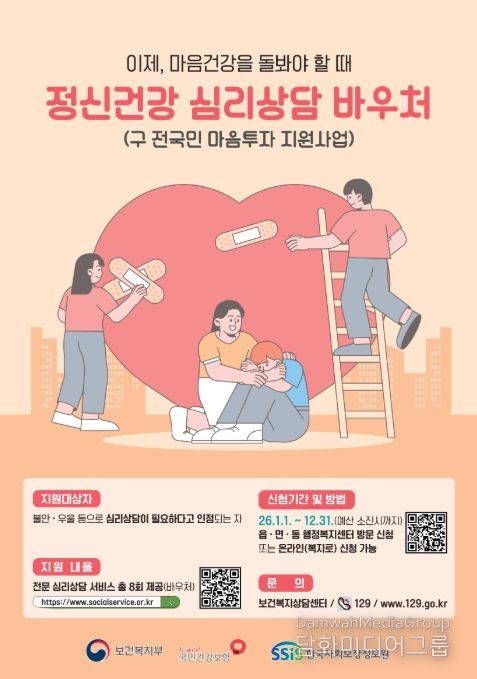 김철영 건강증진과장은 “정신건강 문제는 누구나 겪을 수 있는 만큼 조기에 상담과 도움을 받는 것이 중요하다”며, “심리적 어려움을 겪는 시민들이 심리상담 서비스를 통해 도움을 받길 바란다”고 말했다.