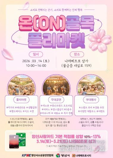 시민행정신문 기자 | 양산시 소상공인연합회(회장 우현욱)에서 골목상권 활성화와 지역 상인들의 판로 확대를 위해‘온(ON)골목 플리마켓’을 3월 14일(토) 나래메트로시티 상가(양산시 골목형상점가 1호), 3월 21일 덕계무지개상점가(양산시 골목형상점가 2호) 인근 덕계2임시 공영주차장에서 개최한다고 밝혔다.