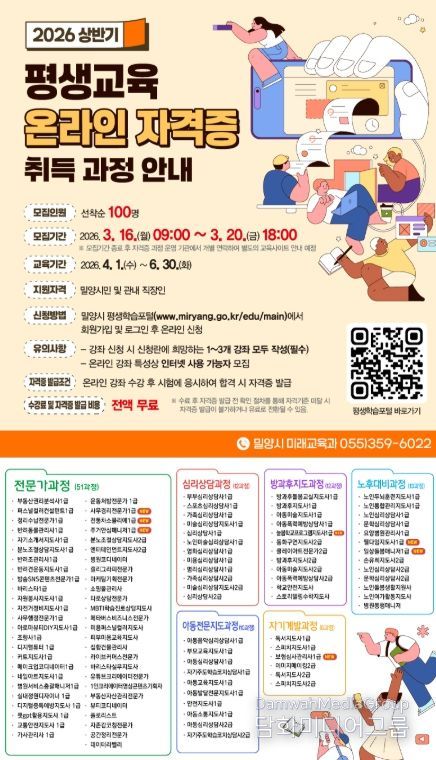 시민행정신문 강갑수 기자 | 경남 밀양시는 시민의 직무역량 강화와 자기계발 지원을 위해 ‘2026년 상반기 평생교육 온라인 자격증 취득 과정’ 수강생을 오는 16일부터 모집한다.