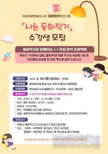 시민행정신문 강갑수 기자 | 거창군은 한마음도서관에서 오는 19일부터 성인을 대상으로 창작의 기쁨을 선사하는 글쓰기 교육 프로그램 ‘나는 동화작가’ 참가자를 모집한다고 밝혔다.