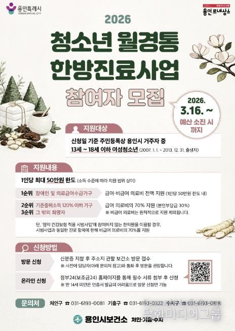 시민행정신문 기자 | 용인특례시는 청소년들의 건강한 성장을 돕기 위해 ‘청소년 월경통 한방진료 지원사업’을 실시한다고 10일 밝혔다.
