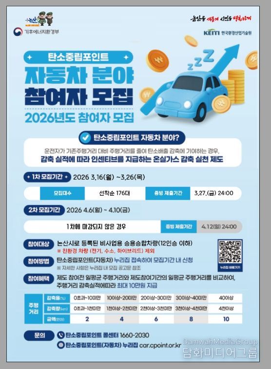 시민행정신문 김학영 기자 | 논산시가 온실가스 감축과 탄소중립 실현을 위해 ‘2026년 탄소중립포인트(자동차 분야)’참여자를 모집한다.