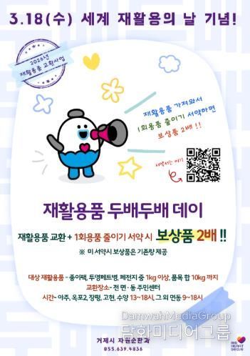 시민행정신문 강갑수 기자 | 거제시는 3월 18일 ‘세계 재활용의 날’을 맞아 자원재활용의 중요성을 알리고, 1회용품 줄이기 실천을 확산하기 위해 ‘재활용품 교환사업’ 보상품을 2배로 지급하는 '재활용품 두배두배 데이'를 개최한다.