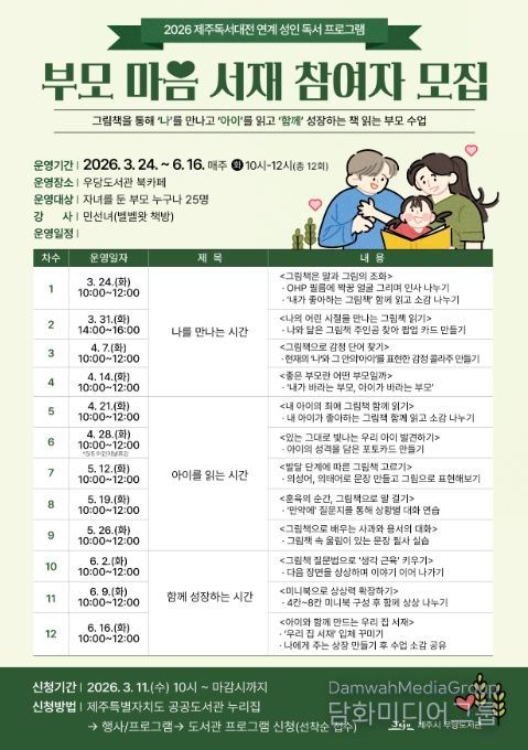 시민행정신문 기자 | 제주시 우당도서관은 부모의 독서 역량을 강화하고 자녀와의 정서적 유대감을 높이기 위한 그림책 소통 프로그램 ‘부모 마음 서재’ 참여자를 모집한다.