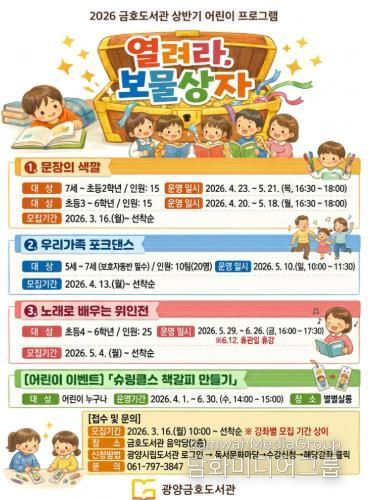 한편, 2026년 금호도서관 상반기 어린이 프로그램과 관련한 자세한 사항은 광양시립도서관 누리집에서 확인하거나 금호도서관으로 문의하면 안내받을 수 있다.