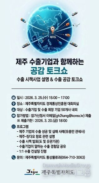 시민행정신문 이세훈 기자 | 제주특별자치도는 오는 25일 오전 10시 30분 제주경제통상진흥원 대회의실에서 ‘2026 제주 수출기업과 함께하는 공감 토크쇼’를 개최한다.