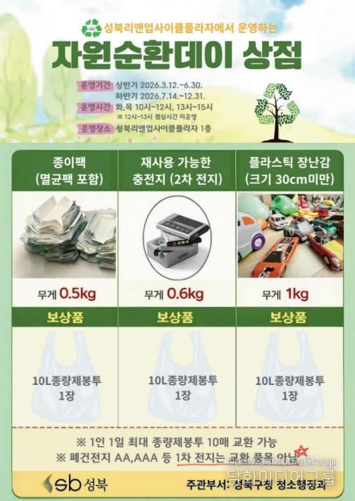 시민행정신문 강갑수 기자 | 서울 성북구가 주민들의 자원 순환 참여를 촉진하고 올바른 분리배출 문화를 확산하기 위해 3월 12일부터 성북리앤업사이클플라자 1층에서 ‘자원순환데이 상점’을 운영한다.