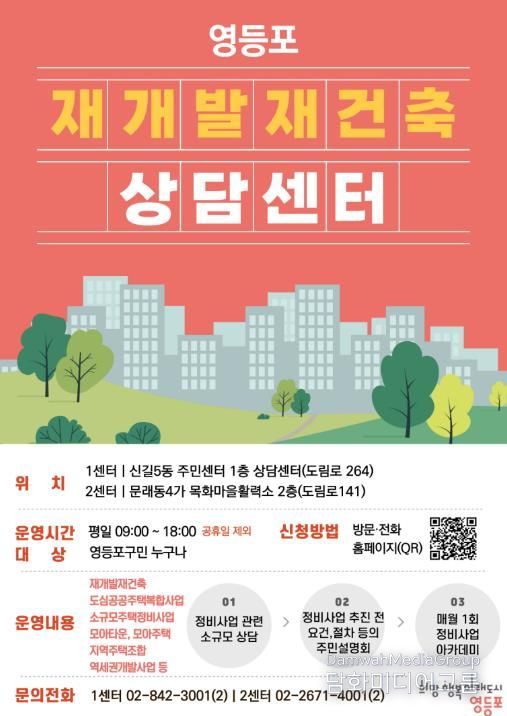 영등포 재개발‧재건축 상담센터는 전문적인 상담을 통해 행정과 주민, 주민과 주민을 잇는 소통 창구로서 정비사업의 투명성을 높이고 원활한 사업 추진을 돕고 있다. 센터는 신길5동 주민센터 1층과 문래동 목화마을활력소 2층에 위치해 있으며, 평일 오전 9시부터 오후 6시까지 운영한다.
