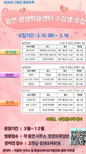 시민행정신문 강갑수 기자 | 고령군은 지역 주민들의 근거리 학습권을 보장하고 폭넓은 교육 기회를 제공하기 위해 3월 10일부터 18일까지 ‘2026년 읍·면 평생학습센터’ 수강생을 모집한다고 밝혔다.