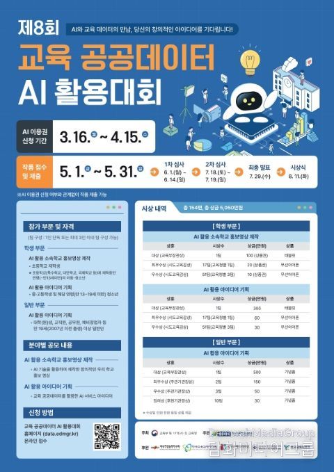 공모는 학생부문과 일반부문으로 나뉘어 진행되며 학생부문은 ▲초등학생 대상‘인공지능 활용 소속학교 홍보영상 제작’▲중·고등학생 대상 ‘인공지능 활용 아이디어 기획’, 일반부문은 대학(원)생·교직원·공무원 등 만 19세 이상 성인을 대상으로 한 ‘인공지능 활용 아이디어 기획’ 분야로 진행된다.