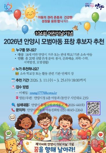 시민행정신문 강갑수 기자 | 안양시는 어린이날을 맞아 다양한 분야에서 모범이 되는 아동을 발굴하기 위해 ‘2026년 모범아동 유공 표창’ 후보자를 11일부터 25일까지 추천받는다고 11일 밝혔다.