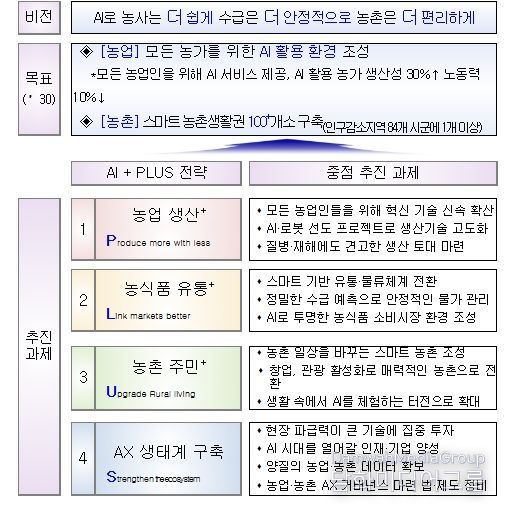 이번 전략은 ‘인공지능(AI)으로 농사는 더 쉽게, 수급은 더 안정적으로, 농촌은 더 편리하게’를 비전으로 설정하고, 이를 실현하기 위해 ① 농업 생산성 혁신, ② 농식품 유통구조 고도화, ③ 농촌 주민 삶의 질 개선, ④ 인공지능 전환(AX) 생태계 기반 조성 등 4대 분야를 설정하고 13대 과제를 중점적으로 추진할 계획이다.