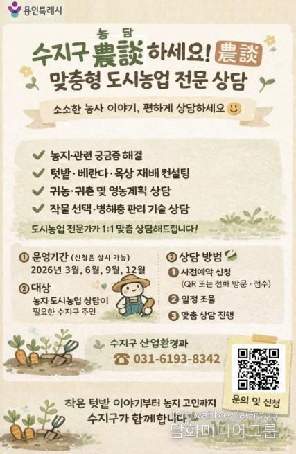 시민행정신문 강갑수 기자 | 용인특례시 수지구는 도시농업에 관심 있는 시민을 대상으로 전문 상담 프로그램인 ‘수지구 농담(農談)하세요’를 운영한다고 12일 밝혔다.
