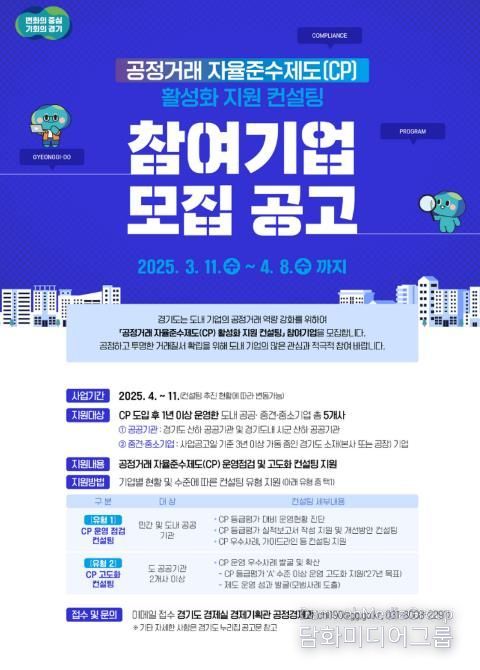 서봉자 경기도 공정경제과장은 “그동안 경기도는 도내 CP 도입 기반 마련에 중점을 두고 지원해 왔다”며 “앞으로는 제도의 실효성을 높이고 우수 사례 확산을 통해 기업의 자율적 준법경영 문화가 자리 잡도록 지속적으로 지원하겠다”고 말했다.