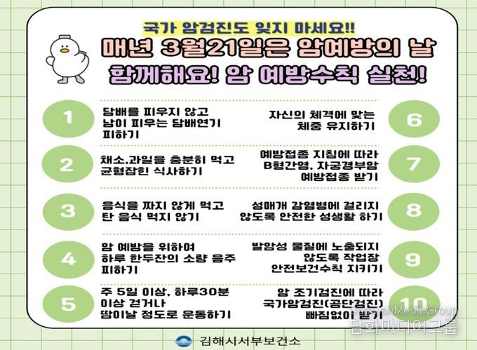 시민행정신문 기자 | 김해시서부보건소는‘암 예방의 날(3월 21일)’을 맞아 국가암검진 및 암 예방수칙 실천 홍보 캠페인을 실시한다고 12일 밝혔다.