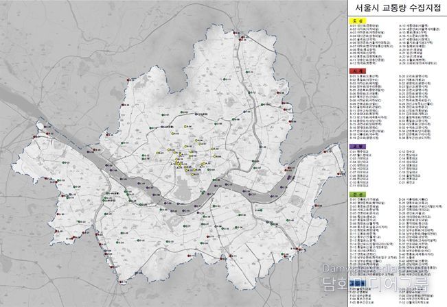 교통량은 서울 시내 주요도로 134개 지점에서 조사했으며, 통행속도는 510개 주요도로를 주행한 택시 위치정보(GPS)와 도시고속도로 내 설치된 1,153대의 지점 검지기 데이터 활용해서 산출했다.
