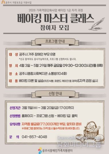 시민행정신문 강갑수 기자 | 공주시장애인가족지원센터(센터장 이영식)는 오는 3월 20일까지 장애인 부모를 대상으로 베이킹 1급 자격 과정인 ‘베이킹 마스터 클래스’ 참여자를 모집한다고 밝혔다.