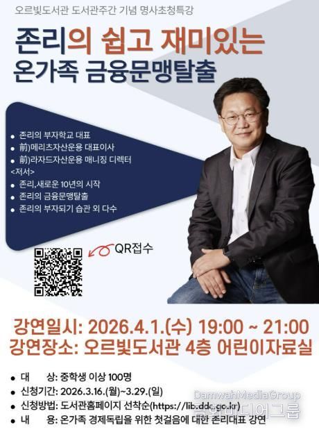시민행정신문 강갑수 기자 | 동두천시 도서문화사업소는 오는 4월 1일 오후 7시, 오르빛도서관 4층 어린이자료실에서 도서관 주간을 기념해 ‘존리의 쉽고 재미있는 온 가족 경제 강연’을 개최한다고 밝혔다. 이번 특강은 시민들의 금융 이해도를 높이고, 자녀와 부모가 함께 올바른 경제관념을 세울 수 있도록 돕기 위해 기획됐다.