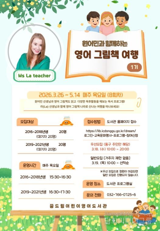 시민행정신문 강갑수 기자 | 인천 동구는 꿈드림어린이영어도서관에서 오는 18일부터 ‘원어민과 함께하는 영어 그림책 여행(1기)’ 수강생을 선착순으로 40명 모집한다고 밝혔다.