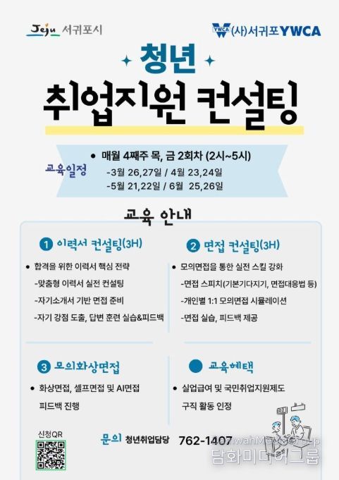 시민행정신문 강갑수 기자 | 서귀포시는 관내 청년들의 실질적인 취업 역량 강화를 위해 (사)서귀포YWCA와 공동으로 ‘청년 취업지원 컨설팅’ 교육생을 모집한다고 밝혔다.