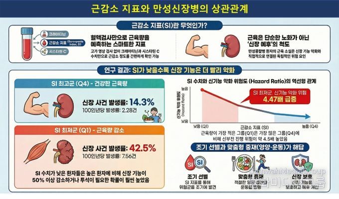 이번 연구에서는 근육 감소가 단순한 노화 현상이 아니라 만성신장병 진행과 밀접한 관련이 있는 건강 지표임을 확인했다. 이는 혈액검사 수치를 이용해 계산하는 근감소 지표(Sarcopenia Index, SI)를 활용하면 근육 상태와 신장 질환 위험을 동시에 평가할 수 있어 임상 활용 가능성이 높다는 점을 보여준다.