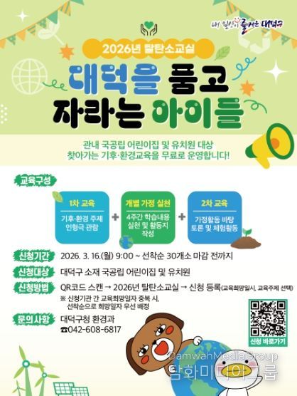교육 신청은 오는 16일 오전 9시부터 대덕구 홈페이지 ‘구민참여 - 행사접수 - 2026년 탈탄소교실’ 메뉴에서 선착순으로 접수할 수 있다.