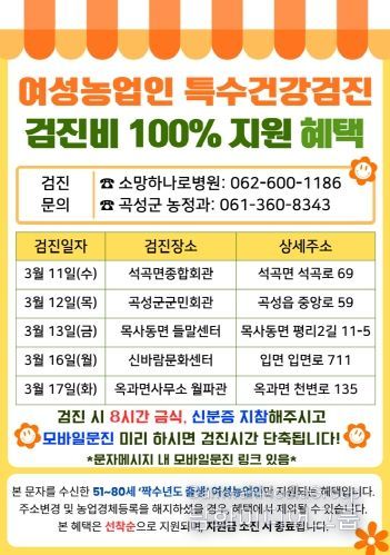 시민행정신문 강갑수 기자 | 전남 곡성군이 농작업으로 인한 직업성 질환 예방과 여성농업인의 건강 증진을 위해‘여성농업인 특수건강검진 사업’을 오는 17일까지 추진한다고 12일 밝혔다.