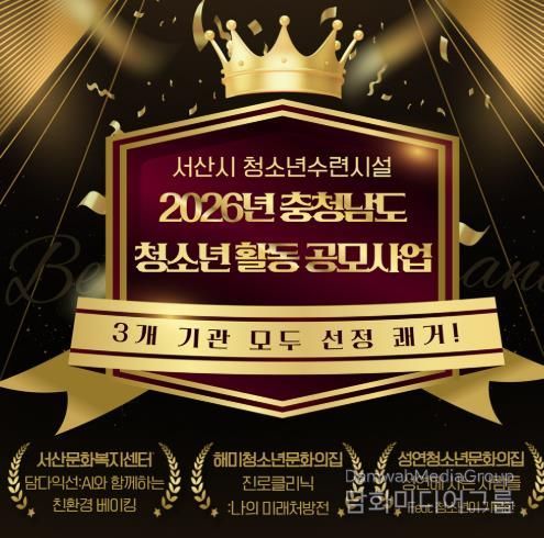 시민행정신문 강갑수 기자 | 서산시 청소년수련시설(서산문화복지센터, 해미‧성연청소년문화의집) 3개 기관이 충남사회서비스원 청소년활동진흥센터가 주최한 '2026년 충청남도 청소년 활동 프로그램 공모사업'에 선정됐다고 밝혔다.