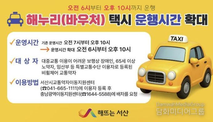 시민행정신문 강갑수 기자 | 충남 서산시는 오는 3월 16일부터 해누리(바우처) 택시 운행시간을 기존보다 1시간 확대 운영한다고 밝혔다.