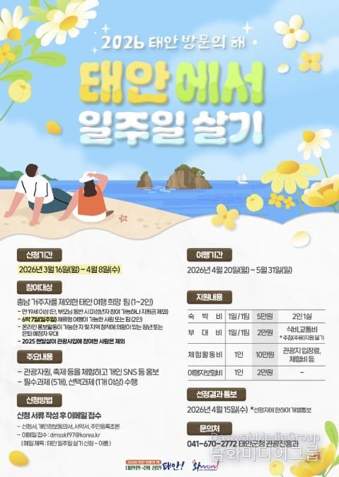 군 관계자는 “태안의 아름다운 자연과 문화를 여유롭게 만끽할 수 있도록 체류형 관광 지원 사업을 알차게 준비했다”며 “관광 도시 태안의 매력을 널리 알리는 데 집중하겠다”고 말했다.